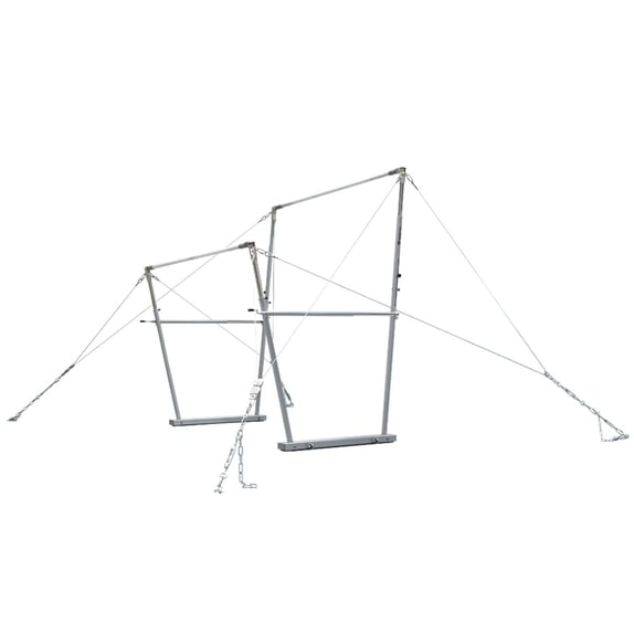 Angepasst an die neuen FIG Standards bietet dieser Spannstufenbarren eine 5 cm weitere Höhenverstellung als seine Vorgängermodelle. Dank der Sicherungsstifte und des Hebels lassen sich die Holme einstellen, ohne die Verspannungen lösen zu müssen.